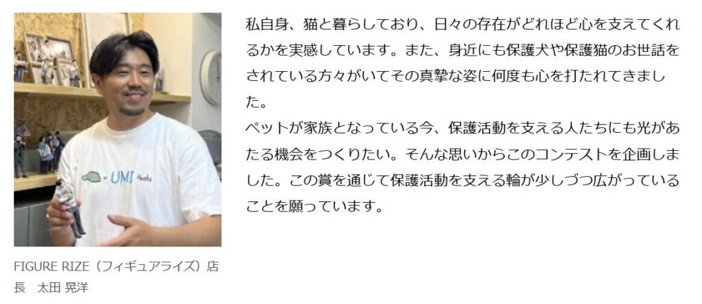 フィギュアライズでは、家族の記念や節目の思い出にスタジオを訪れるお客様が多く、その中で「ペットが家族の中心になっている姿」「動物との絆に支えられる姿」を目にしてきました。幸せの撮影の裏で保護活動を続ける人々にも光をあてたい、という思いからこのコンテストを企画しました。